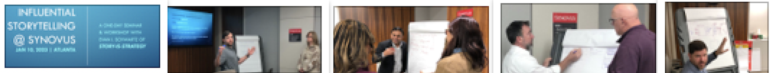 “The workshop on Influential Storytelling that Evan led resulted in a captivating, engaging day for our innovation team and led to impact across the organization.” - Matthew Maxey, Chief Innovation Officer, Synovus Bank